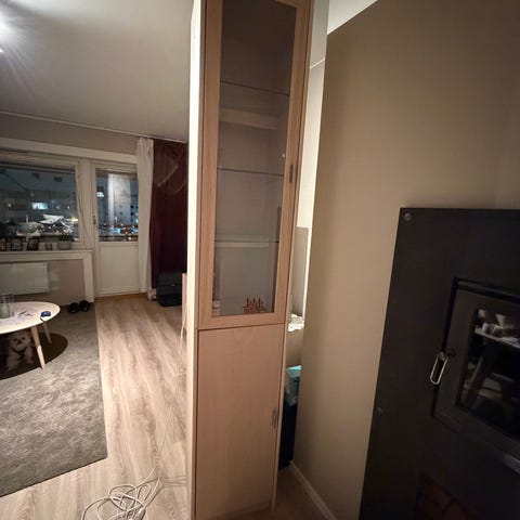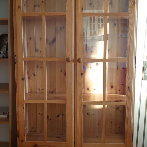 Første mann til mølla, Pent brukt vitrineskap gis bort.