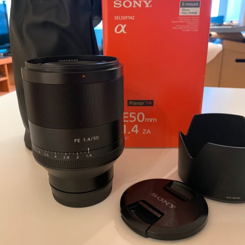 Selger mitt Sony FE 50mm f/1.4 GM, komplett med original emballasje, hette og bæreveske.