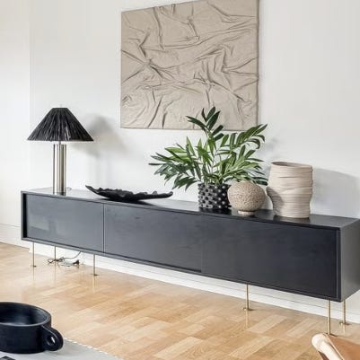 Nydelig sort tv bord. 2 romlige skuffer i midt. Skyvedører som er frostet glass, 2 stykk på hver side som inneholde god plass med glasshylle.