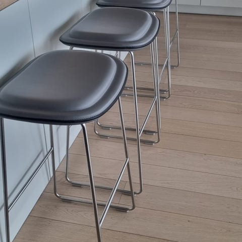 Stolene er i hel og pen stand, men har noen bruksmerker etter normal bruk. De er ikke perfekte, men veldig fine – og med riktig miljø vil de løfte både kjøkkenøy, barløsning eller loungeområde til et helt nytt nivå.