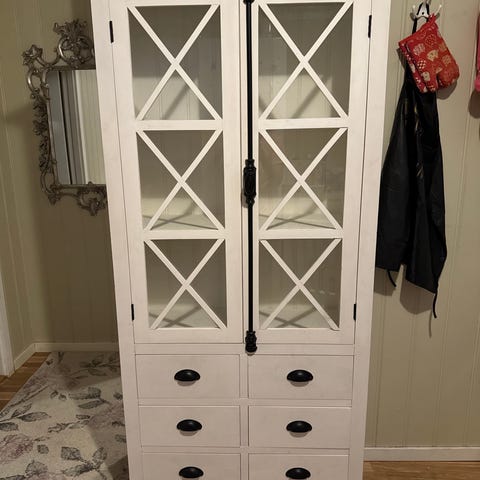 Ønsker å kjøpe brukt oppbevaringsskap m. 4 hyller i hel bredde (ikke skillevegg). H 200-220cm B 120-150 D 40-45. Helst lys farge, som for eks. eik.