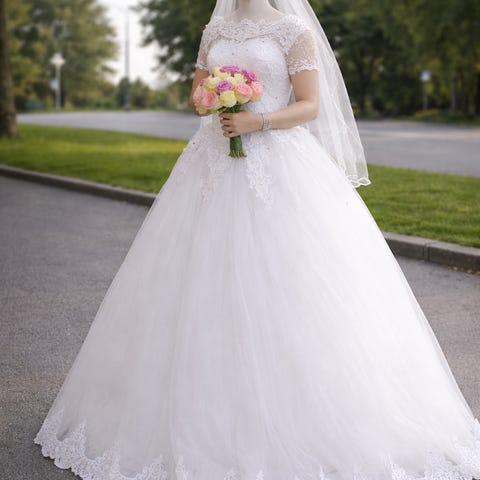 Selger en brudekjole i designer merket Lorange som er brukt kun 1 gang i str 44 (tilsvarer norsk str 36-38), men kan også gjøres smalere ved hjelp av snøring i ryggen. Følger også med et underskjørt med bøyle. Renset etter bruk. Følger med pose til å ha utenpå. Kom gjerne med bud.