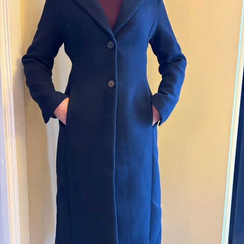 Riccovero Kåpe i blå farge, størrelse 38 for kvinner. Kåpen har knapper foran og lommer på sidene. Materialet fremstår som vevd stoff med en strukturert overflate.