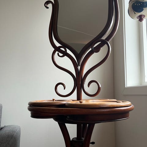 Et unikt, antikk, miniatyrisert, bærbart sminkebord for barn