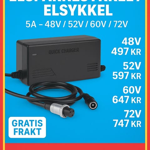Sliter du med en treg eller ødelagt lader? Jeg selger nye, kraftige 5A hurtigladere som passer de fleste elsparkesykler og elsykler på markedet – og jeg tilbyr fast lavpris + gratis frakt i hele Norge!