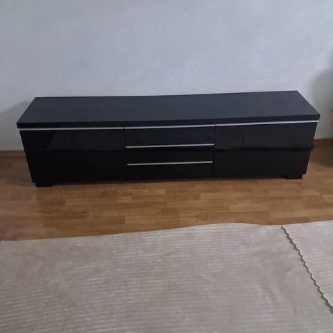 TV-benk selges. Godt brukt, men er fortsatt brukandes. To skuffer og ett skap, samt hylle i midten. Åpen bak i midten for ledninger. Ferdig demontert og klar for henting. Har håndtak til nederste skuffen, var demontert som barnesikring.
