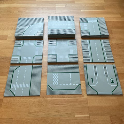 Selger en original Lego baseplate 32×32 med trykket vei-/garasje-mønster.