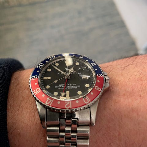 Denne er 40 mm og bærer utrulig fint. Oysterlenka er crispy og lager den fineste lyden. Dette er en legende av en klokke og det er ikke noe tull her. Coke bezel er det tøffeste, men vil du ha Pepsi så får du kjøpt den ny hos AD, eller brukt for blodpris på nett.