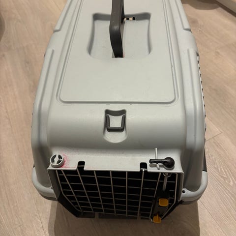 Fint brukt hundebur med håndtak og to rom oppå. 70x 47 lengde og bredde, høyden er 50 cm.