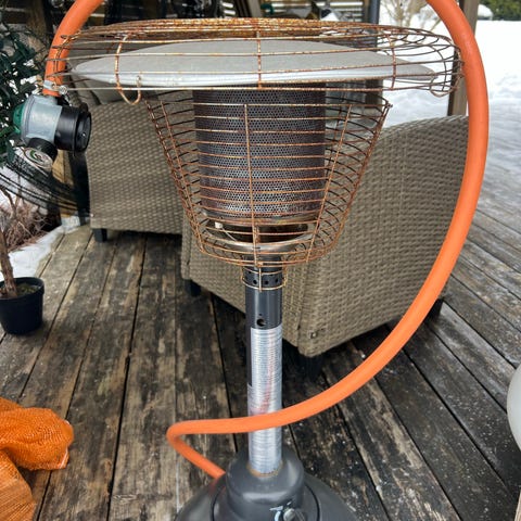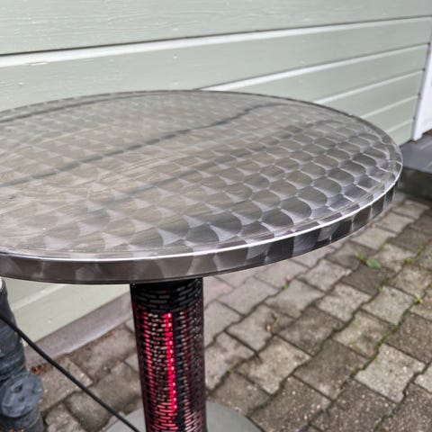 Infravarmeren har glassplate på toppen, brukes som bord. Den er 85cm høy. Må hentes I Grimstad.