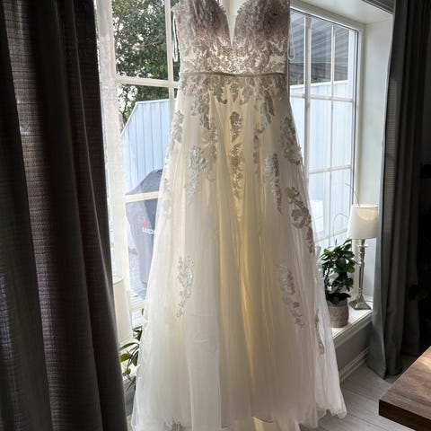 Ubrukt brudekjole «morilee suri» selges. Helt nydelig kjole, spesielt bak, med den åpne ryggen med perledetaljer på stroppene og det fine slepet🌸