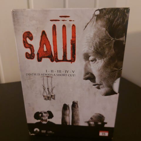 Saw DVD bokssett som inneholder flere filmer i skrekkfilmsjangeren. Passer for voksne på grunn av innholdets aldergrense