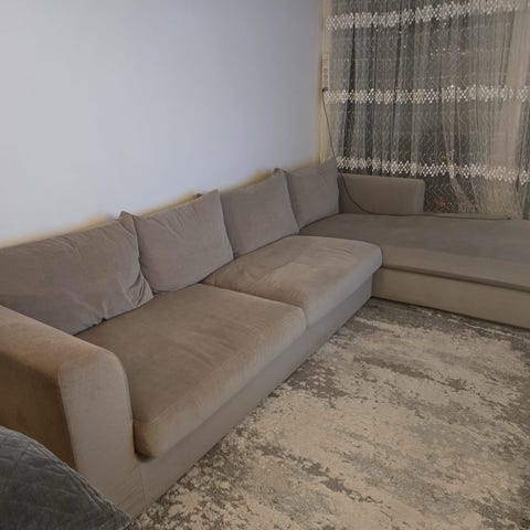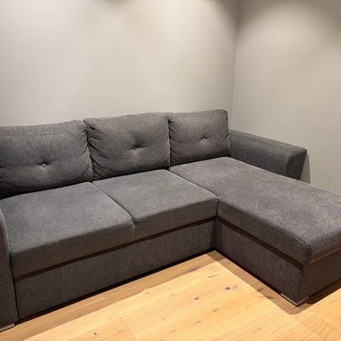 Hjul som ligger under senge delen er knekt men det påvirker ikke funksjonen til sofa. Lange delen lager høye lyder når man sitter eller legger seg. (Derfor selges billig)