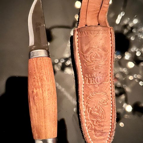 Brusletto Stetind kniv med slire i sort lær. Kniven er så og si ikke brukt.