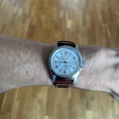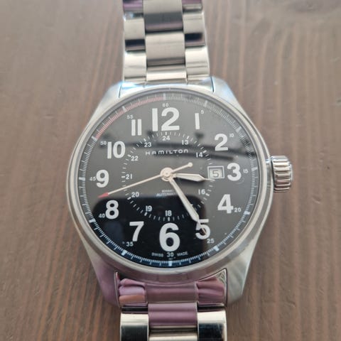 elger en Hamilton Khaki Field Mechanical 42mm (Ref. H69529133), kjøpt 18.08.2025 hos ditur.no. Klokken er minimalt brukt og fremstår som ny.