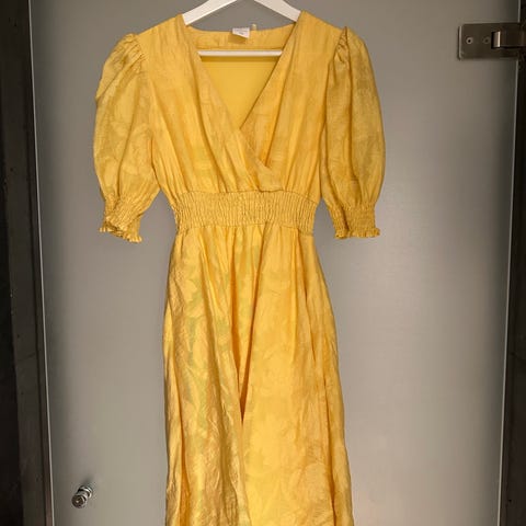Samsøe Samsøe festkjole i gul farge, størrelse 36 for kvinner. Kjolen har lange ermer og er åpen foran med flatterende knyting. Passer fint for formelle anledninger.