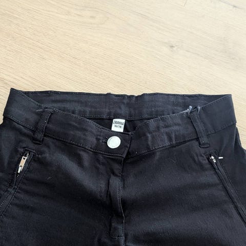Buksene er lite brukt da de ble for små, og de er vasket på finvask uten skyllemiddel for å bevare stretchmaterialet.