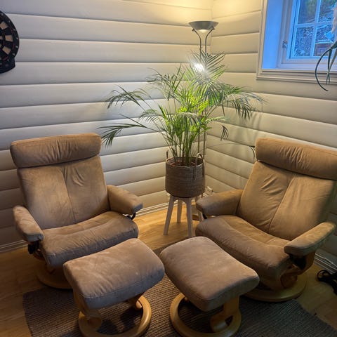 2 stk Ekornes London med medium rygg og fotskammel selges. Den ene er 1 år gammel, nesten ikke sittet i, den andre er 2 år gammel, og svært lite brukt.