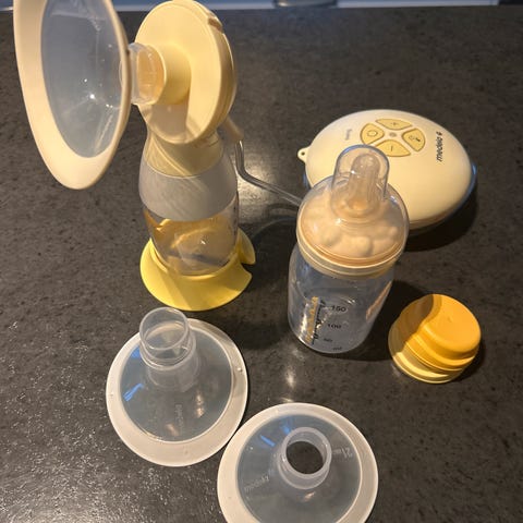 Medela Swing elektrisk brystpumpe selges. Inkluderer pumpeenhet, flaske, oppsamlingsposer, oppsamlingskopp som kan brukes til håndpumping, samt oppbevaringspose og bruksanvisning.