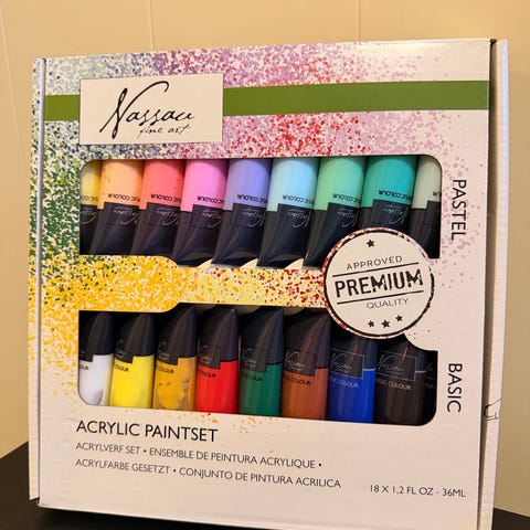 Kkvarellmalingdett som inkluderer flere farger i tuber, et bredt utvalg av pensler i ulike størrelser og former, samt keramiske malepaletter med fire seksjoner. Penslene har trehåndtak og egner seg for akvarellmaling. Settet inneholder også papirark for akvarellmaling (ca 15 stk). Settet er brukt et fåtalls ganger.