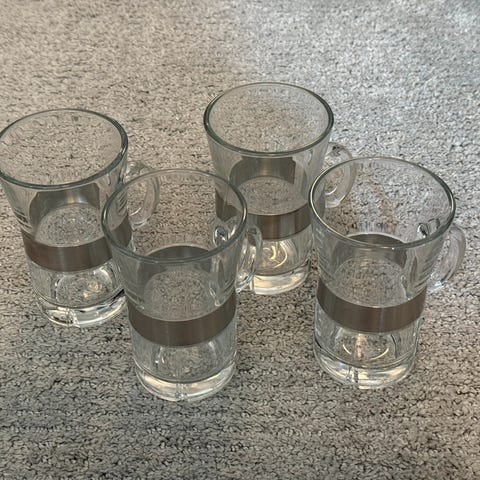 Laget av klart glass med metallring som dekorasjon. Egnet for servering av varme drikker som kaffe eller te.