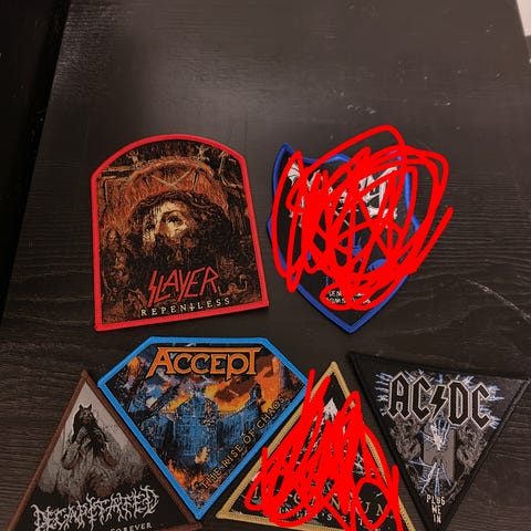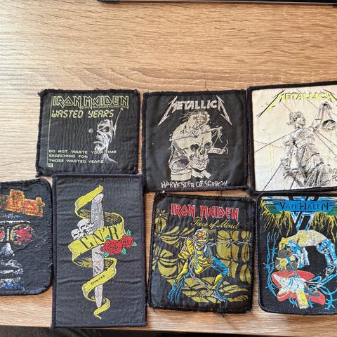 Har ett lite assortert dublett utvalg broderte tøymerker til salgs. Har disse ; Elvis, INXS, Kiss, The who. Dire Straits, Deep purple, Black Sabbath, Eric Clapton, Judas Priest, Bon Jovi, MeatLoaf, METALLICA. Gitar.