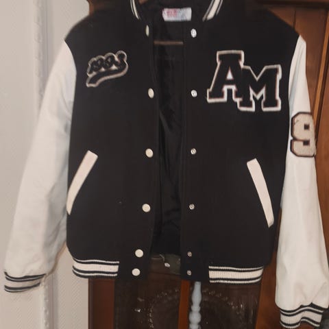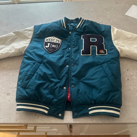 Collegejakke i grønn med kremhvite ermer i «skinn» str 146