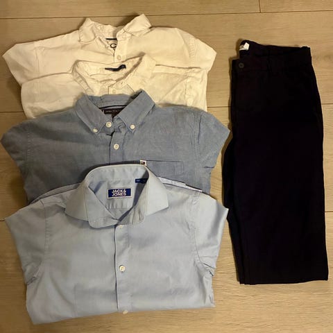 Selger et sett med pentøy i størrelse140. Veldig fin rutete skjorte fra Jean Paul som knapt har vært brukt. Mørkeblå bukser fra Name it og mørkeblå shorts fra Cubus som begge passer fint til skjorta.