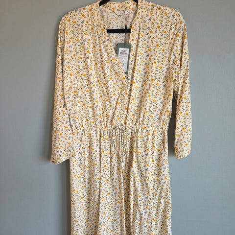 ONLY Sommerkjole i brun farge, størrelse 36 for kvinner. Laget i lett materiale med kort arm og omslagsdesign. Passer til sommerbruk.