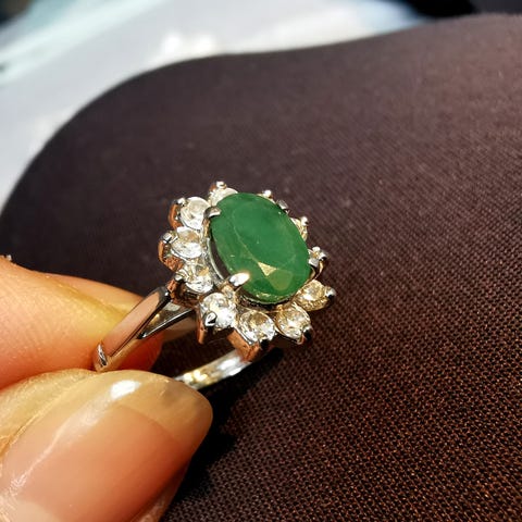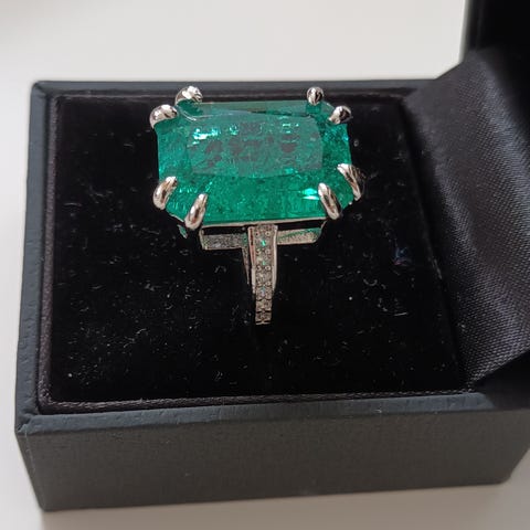 Her får du en eksklusiv og helt ny håndlaget ring i massivt 18K gull, smykket med en sjelden, naturlig smaragd fra Muzo – verdens mest ettertraktede smaragdgruve i Colombia. Smaragden måler hele 11,04 x 6,38 x 4,96 mm og er omkranset av briljantslipte diamanter for et ekstra luksuriøst uttrykk.