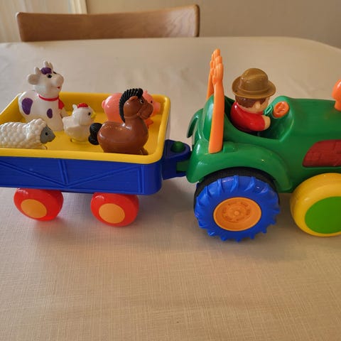 Megcos leketraktor. Litt usikker på om den nå virker med lyd og lys. Henger og person til å sitte oppi følger ikke med. Sendes mot frakt.