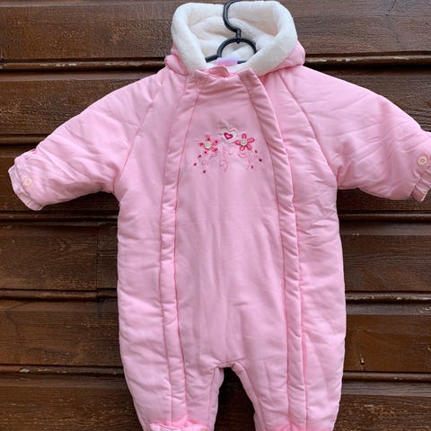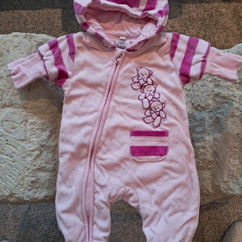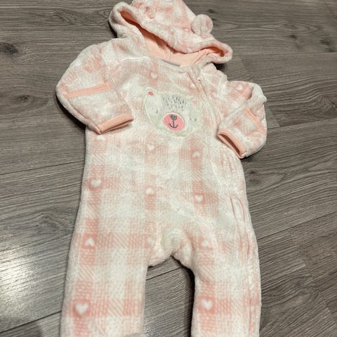 Hust & Claire babyheldress i størrelse 50, rosa farge, designet for jenter. Laget av mykt materiale med hette og trykk foran. Passer for nyfødte og små babyer.