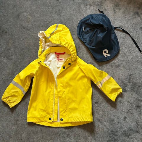 Reima barn regntøy i størrelse 98, gul farge, unisex modell. Settet består av en gul jakke med hette og refleksdetaljer, samt mørkeblå bukser med justerbare stropper og elastiske mansjetter. Materialet er vanntett og egnet for bruk i vått vær. Ødelagte stropper på bena. Kan lett erstattes av nye.