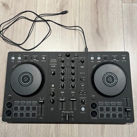 Pioneer DJ DDJ-200 DJ-kontroller med USB-tilkobling og Bluetooth-støtte. Enheten har to jog wheels, flere kontrollknapper og miksere, samt innganger for hodetelefoner og mikrofon. Designet for enkel tilkobling til PC, Mac, smarttelefon eller nettbrett, egnet for nybegynnere og mobil DJ-bruk.