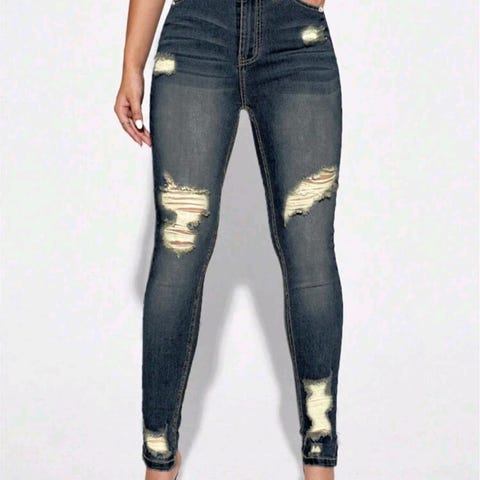 Svart skinny jeans for women, størrelse S med midje W27. Jeansene har en svart farge med slitt og revet detaljering på fronten og to lommer bak. Materialet er denim, og de er designet for en tettsittende passform.