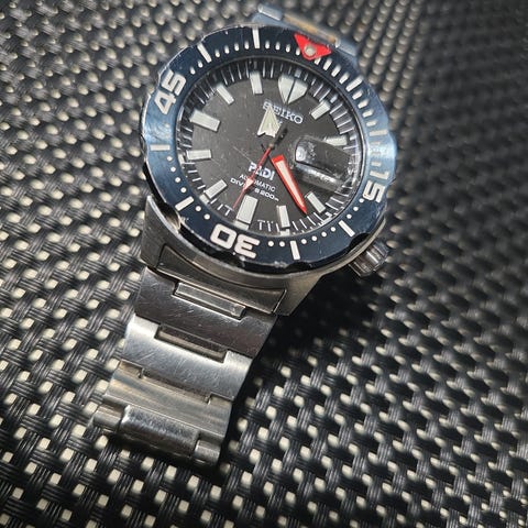 Seiko dykker herreklokke med svart urskive, gummirem og flere funksjonsknapper. Klokken har et robust design med en rund kasse i metall, tydelige markører og visere, samt en justerbar rem med spenne. Egnet for daglig bruk og ulike aktiviteter.