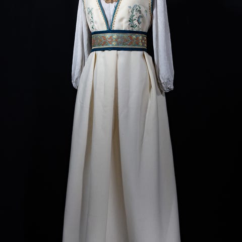 Kan hjelpes til å stille/sy på hvor stram du vil ha den i livet, og i lengden. Følger med lin skjorte, forkle, veske(uten sølv)
