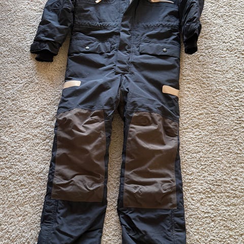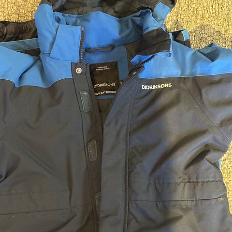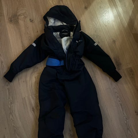 Didriksons barne vinterdress i størrelse 130, unisex modell. Dressen har blå farge med mørkere detaljer, og er designet for å gi beskyttelse mot kulde og vær. Egnet for utendørs bruk i kalde forhold. Det er ett veldig lite hulk på høyre kne, som det er satt en vanntett lapp ove(se bilde 3 og 4). Dressen er ellers ikke synlig brukt.