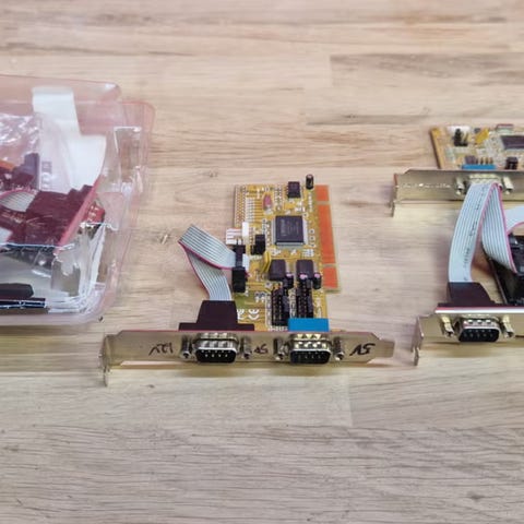 NetMos Technology EX-416SR PCI seriell adapterkort med to RS-232 porter. Kortet har en gul PCB og benytter NetMos NM9835CV chip. Designet for å gi ekstra seriell tilkobling til PC-er med PCI-spor.