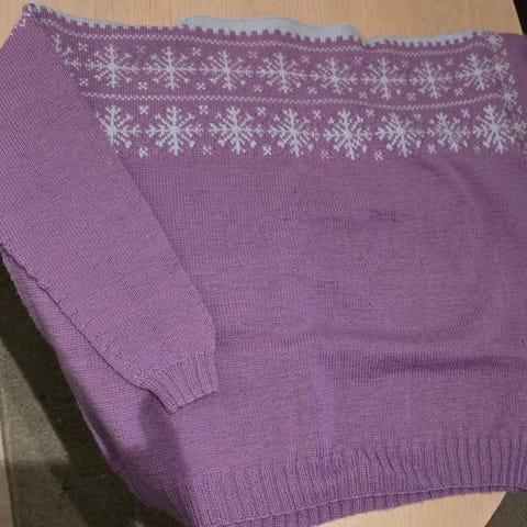 Den er strikket fra PetiteKnit sin oppskrift. Genseren er i en nydelig aprikos/rosa farge . Den er strikket i flora og kid Silk ( hvit).