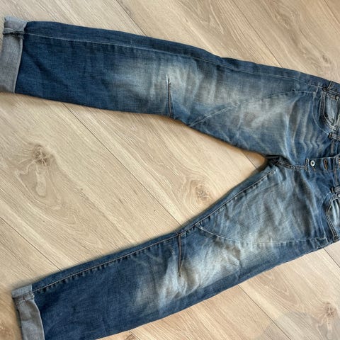 Jeans fra Please str S. Strikk i livet bak. Ankellengde. God stretch
