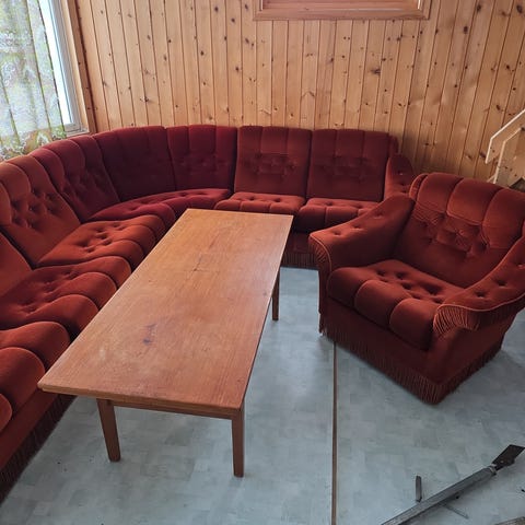 Godt vedlikeholdt, like pen. Ingen slitasje. Toseter, treseter og to stoler.