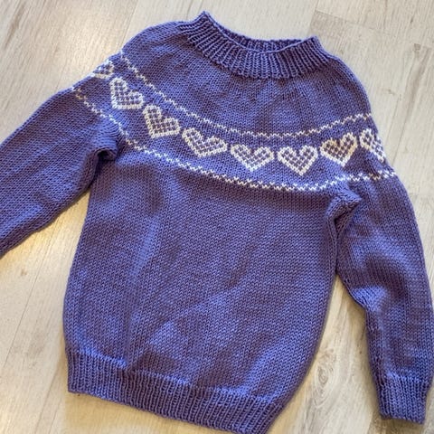 Nydelig hjemmestrikket genser i fiolett / lilla farge med hvitt mønster. Anslår størrelse 110, ryggen er ca. 41 cm lang og arm fra armhule til mansjett ca. 28/29 cm.