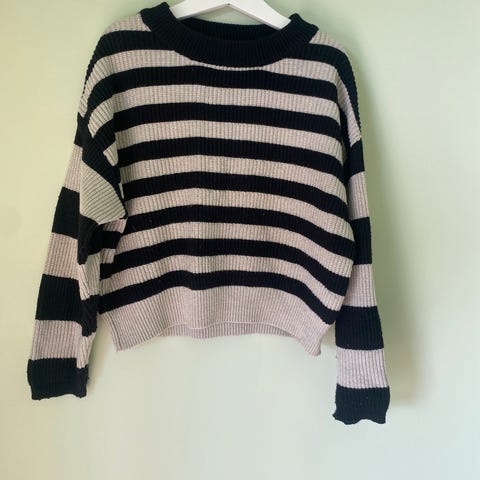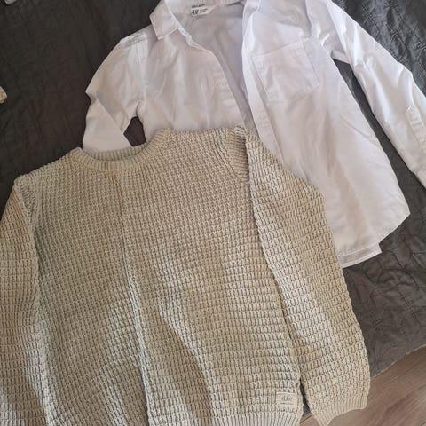 Superfin genser med hvitt og blått fiskebensmønster i strl 134. 100% bomull.
