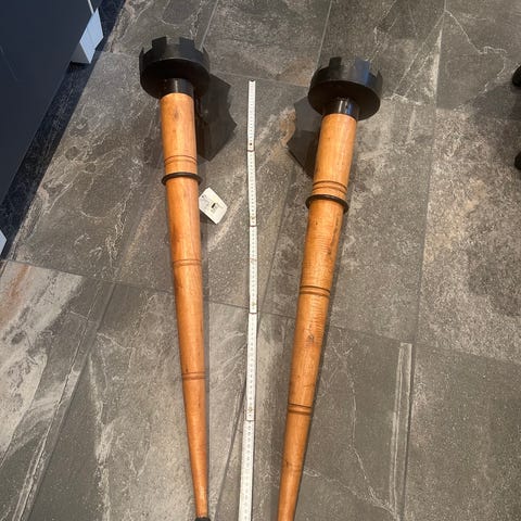 To lysestaker i tre, med metall innsats til feste av lys. Passer til standard lys.