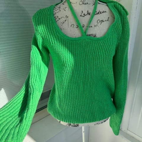 Genseren har en unik halsdesign med dekorativ stropp, som gir et feminint og moderne uttrykk. Mykt og behagelig materiale, ideell for både hverdagsbruk og mer pyntede anledninger.