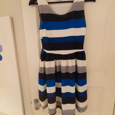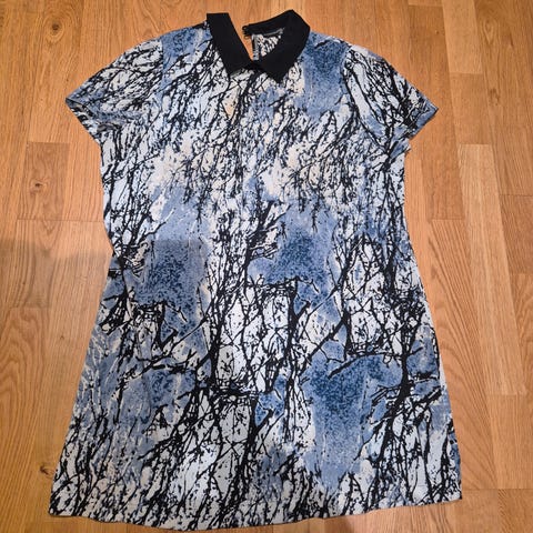 En pent brukt kjole med nydelig mønster i blålige farger selges billig. Den er i str. 36 fra Atmosphere.