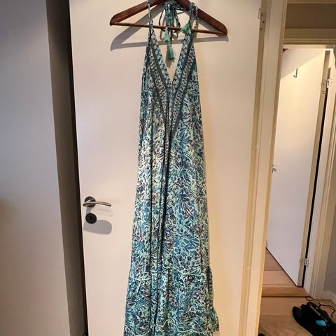 sommerkjole i størrelse 36 for kvinner. Kjolen har en grønn farge med mønsterdetaljer og tynne skulderstropper med knytting. Materialet er lett og egnet for sommersesongen.