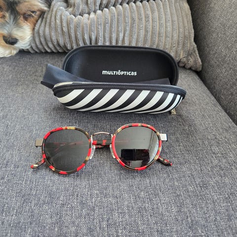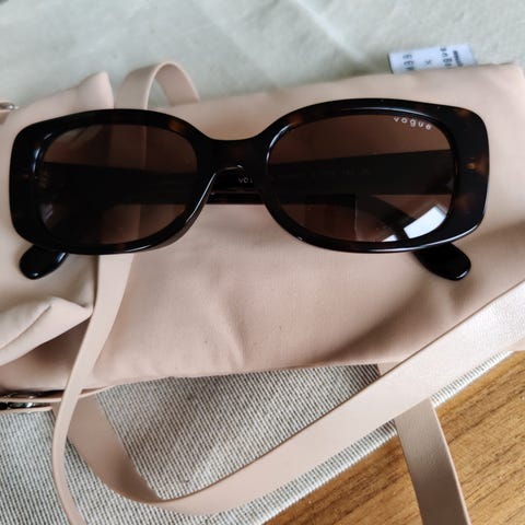 Eksklusive solbriller fra norske Møy Atelier. Oval form med bruntonede glass, gullramme med tvunnet detalj og hvite stenger. Unikt, edgy design som skiller seg ut. Str. 54–19–135.