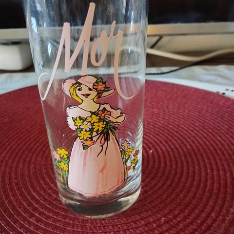 Søtt retro/vintage (?) glass/drikkeglass med påskrift «mor» og motiv av nydelig dame.